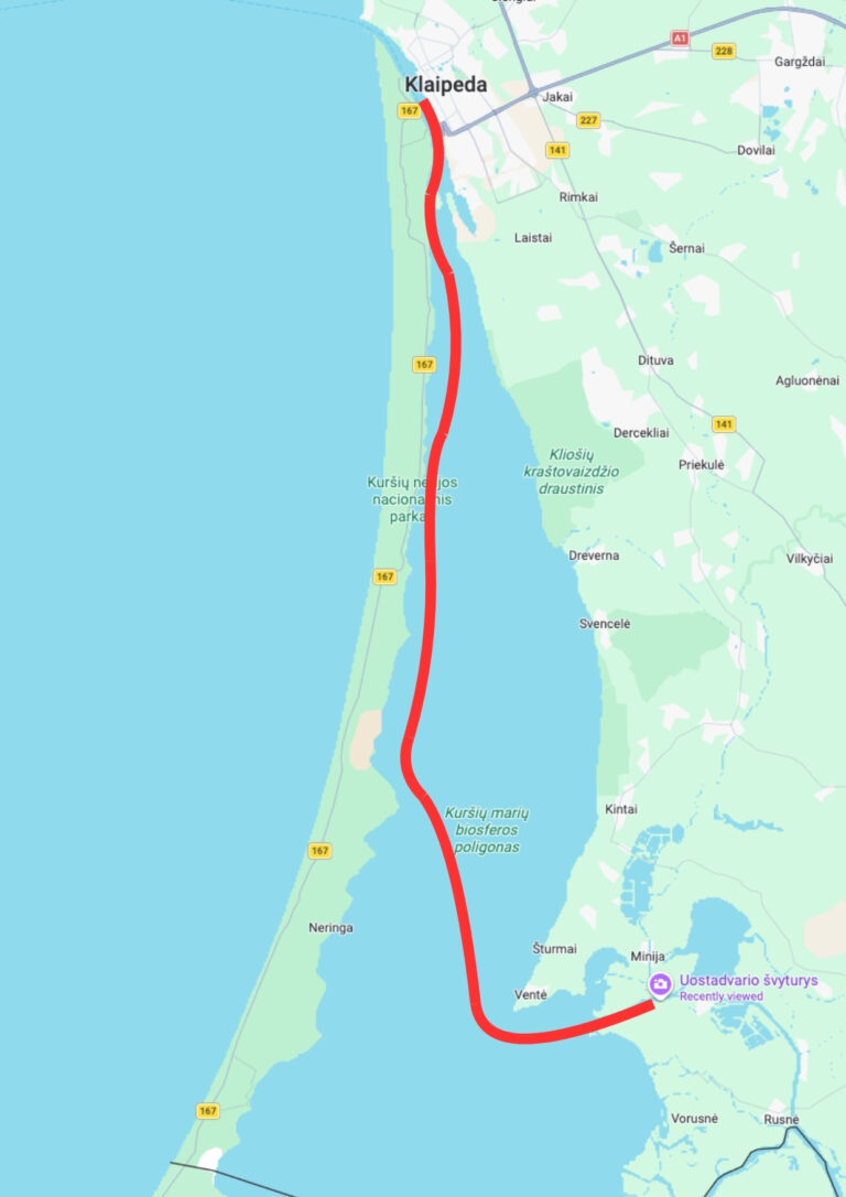 Kelionė jachta iš Klaipėdos į Mingę atskleidžia įvairius Kuršių marių kraštovaizdžius - nuo industrinių uosto siluetų iki laukinės gamtos pakrančių. Išplaukiant iš Klaipėdos, akis traukia aukšti kranai, sandėlių linijos ir lėtai judantys krovininiai laivai, pro šalį kursuoja turistų keltas, tolumoje matyti suskystintų dujų terminalas. Dešiniajame borte driekiasi Smiltynės krantai su Kurhausu, tolumoje matyti siaura Kiaulės nugaros juosta, o už uosto ribų atsiveria plati ir rami Kuršių marių erdvė.